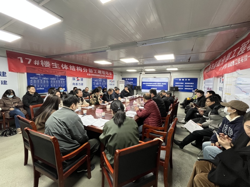 12月12日上午,我校校本部教职工住宅楼一期项目(崇业路)17#楼地基与基础及主体工程验收会在项目部会议室召开。雁塔区住建局质监站,项目勘察、设计、监理、施工及基建处等五方责任主体单位项目负责人参加会议,会议由基建处处长王兴刚主持。